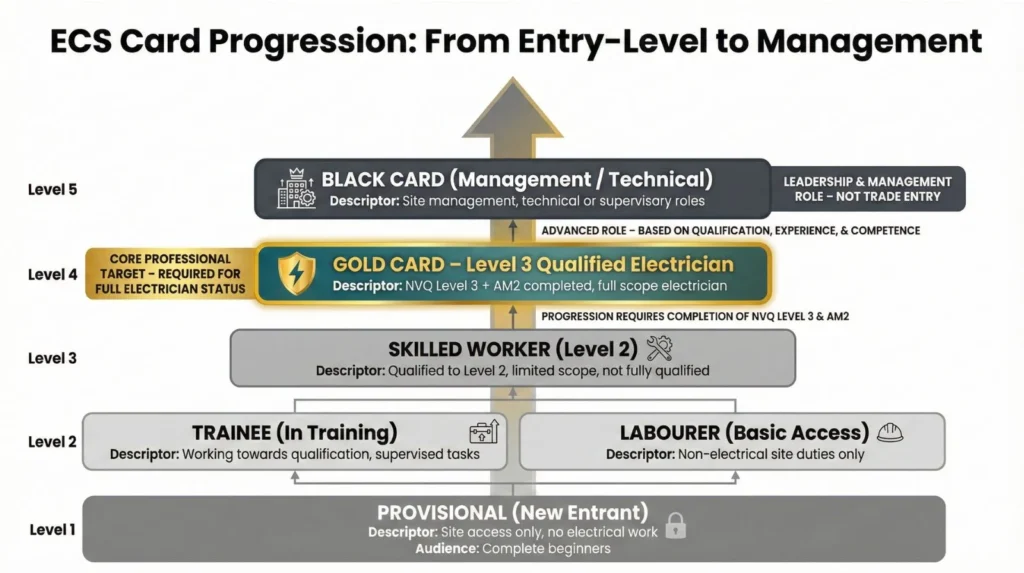 ECS card structure illustrating progression from entry-level site access to fully qualified electrician and management roles.