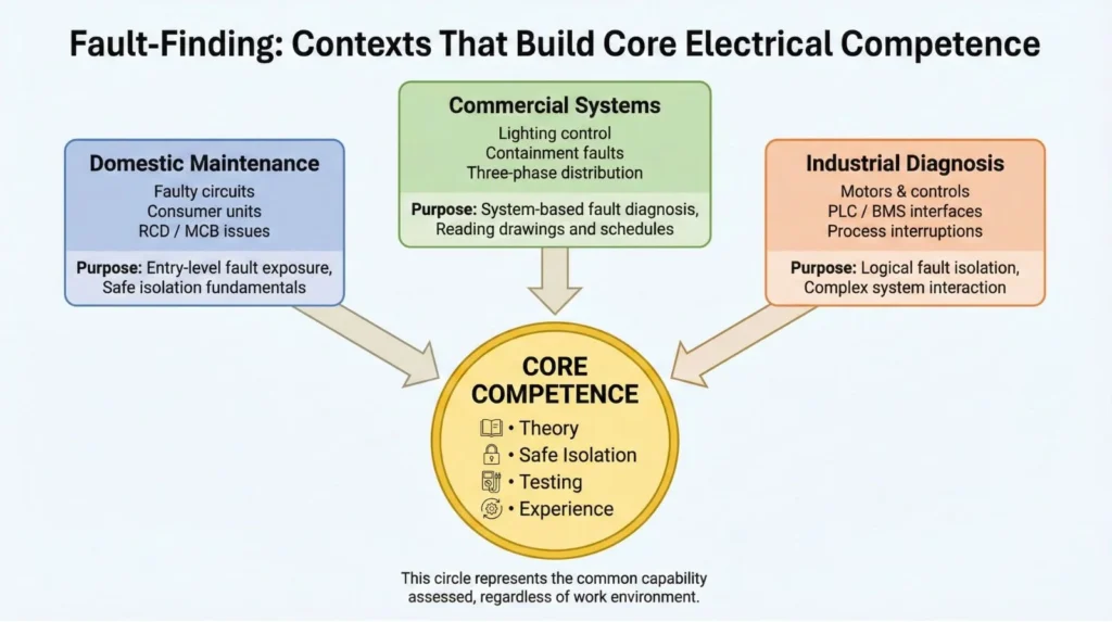 These aren’t separate qualification categories. They’re contexts where the same underlying competence applies: understanding electrical principles, following safe isolation procedures per HSE guidance GS38, using calibrated test equipment correctly, interpreting measurements against expected values, and making informed decisions about remedial actions. Short fault-finding courses simulate these scenarios but don’t assess competence formally or create credentials recognized by employers, insurers, or scheme providers.
