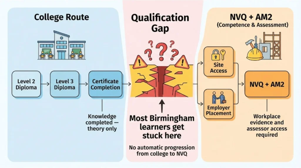 Here’s the part most Birmingham electrical courses don’t advertise upfront: City & Guilds 2365 diplomas (Level 2 and Level 3) don’t make you a qualified electrician. Neither do short courses in 18th Edition wiring regulations. The only route to industry-recognised qualified status is NVQ Level 3 (City & Guilds 2357 or EAL equivalent) plus AM2 practical assessment, and neither can be completed in a college workshop.