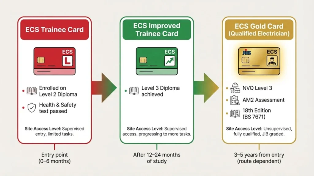 ECS Trainee Card: This requires registering as a learner and passing a basic health and safety test. It’s your site access pass while you’re building competence.
