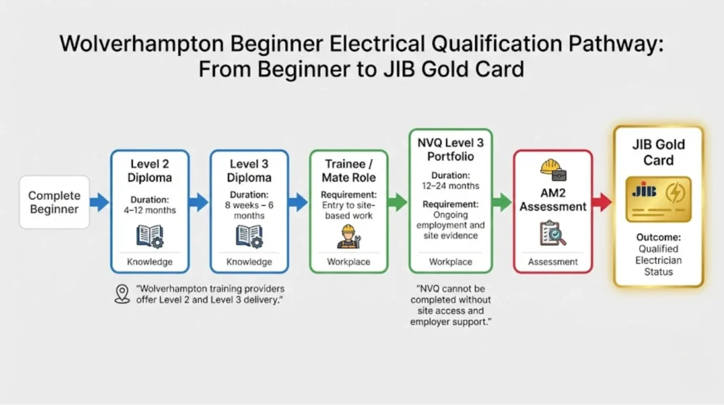 Here’s what matters: Wolverhampton has legitimate beginner routes, but the path from complete novice to qualified electrician (JIB Gold Card holder) isn’t a single course. It’s a structured sequence involving classroom knowledge, workplace competence, and national assessment. The electrician courses Wolverhampton providers offer cover different stages of that journey, and knowing which stage you’re at makes the difference between wasted money and genuine progress.