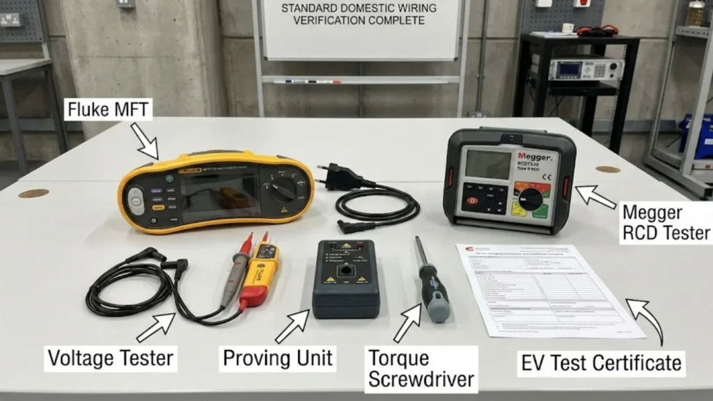 Standard electrical tools cover most EV installation work, but testing and commissioning require specific equipment.