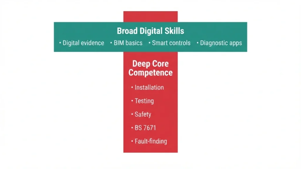 The T-shaped skills model showing why deep electrical competence matters more than digital breadth.